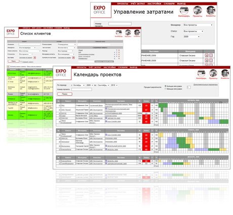 Информационная система проектного администрирования EXPOOffice предназначена для: ведения выставочных проектов; ведения клиентской базы, учета и планирования контактов с клиентами; создания единого хранилища проектных документов (коммерческие предложения, договора, сметы, эскизы, планы и т.п.); онлайновой работы с докуметами непосредственно в EXPOOffice без необходимости наличия пакета MS Office; визуализации и отслеживания хода проекта, отображения интерактивного графика проектов; учета любых затрат по проекту, в том числе материалов, оборудования, затрат на автотранспорт и трудозатрат с получением отчетности по каждому проекту и по всей компании в целом; возможность расчета фактической заработной платы сотрудников на основе почасовых и помесячных ставок, бонусной части; управления складом материалов и арендным складом с возможностью бронирования выставочного оборудования под конкретные объекты и отслеживанием заявок на закупку материалов и оборудования; оповещения участников проектов о необходимости выполнения задач и контрольных точках; локальной работы в офисе и доступа к системе через Интернет.