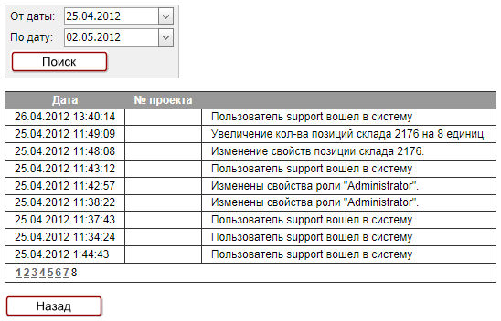 Все значимые действия пользователя в системе записываются в лог. Также записывается дата и время входа пользователя в систему. Доступ к логу каждого отдельного пользователя осуществляется из списка пользователей нажатием кнопки